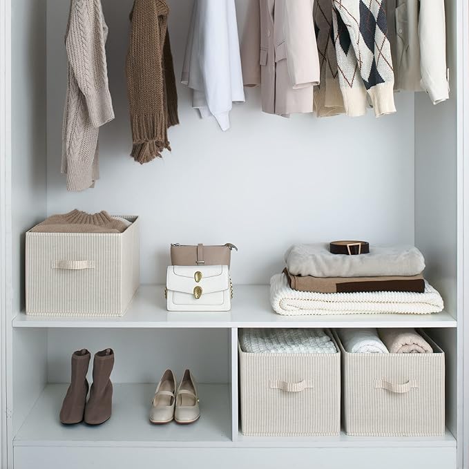 StorageWorks Storage Baskets for Shelves, Foldable Fabric Closet Storage Bins with Handles, Fabric Storage Bins Clothes Organizer, Beige Stripes, 3-Pack, Extra Large