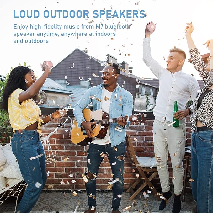 - đăBluetooth 5.0 & Wireless Stereo Pairingă: A new generation of Bluetooth 5.0 technology, transmitted by A2DP technology, has lower power consumption than Bluetooth 4.2 but with faster transmission,stronger anti-interference ability and more stable signal without any delay. Two M7 Wireless Speakers can be paired for true wireless Bluetooth playback on the left and right channels of the two M7 Bluetooth speakers.