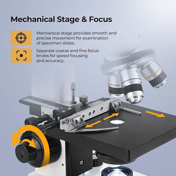 - [Mechanical Stage]: With 1.0mm stage divisions, locks slide into place and provides precise slide manipulation along the X- and Y-axis to allow coordinates to be recorded, enabling the viewer to return to a specific location on the slide.