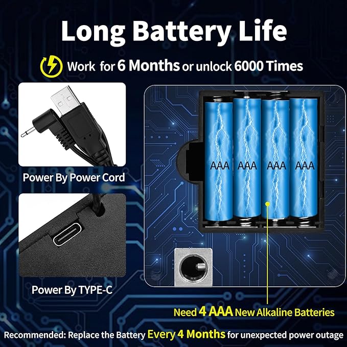 - âăLong Standby TimeăElectronic cabinet lock need installed 4 aaa new alkaline batteries (no included), which can work for 6 months or unlock 6000 times, but recommends replace the battery every 4 months for avoid power off locking, lock also support powered by power cord or Type-C