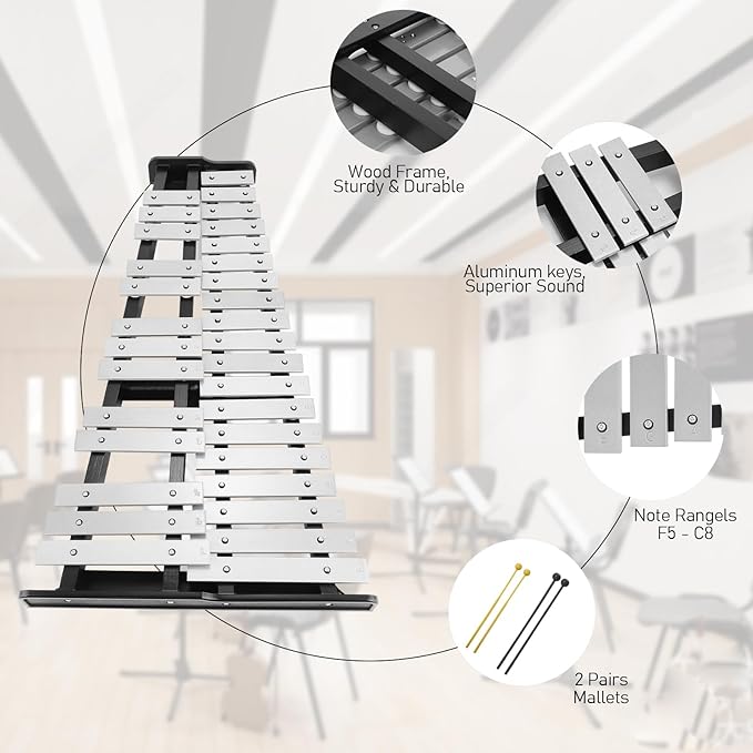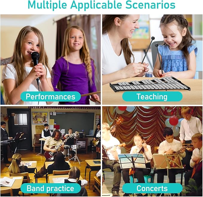 - 【High quality and stable structure】Selection of aluminium plates for a 32-note percussion glockenspiel that is durable and durable. The floor stand is metal coated and constructed in a triangular structure that has a stable structure. The non-slip pads on the bottom also increase the stability of the stand.