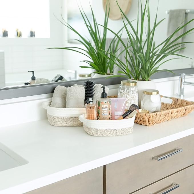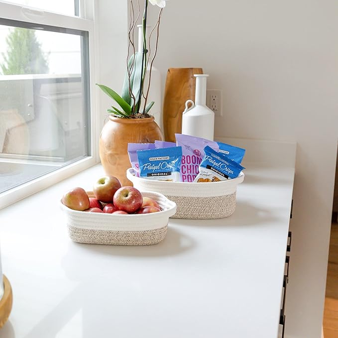 - 5 BASKETS FOR 5X THE ORGANIZING POWER: Life is messy...but your house doesn’t have to be! With 5 beautiful rope baskets for organizing, you’ll defeat messy rooms like a true supermom! Use the largest baskets for Montessori displays or countertop fruits holder, create the cutest dog toy storage or bathroom hand towel holder with the medium ones and stash jewelry or keys in the smallest. Biggest (11.8"x8.7"x4.3"), (11"x7.9"x3.9"), (10.2"x7.1"x3.5"), (9.1"x6.3"x3.1"), Smallest (7.9x5.5"x2.8")