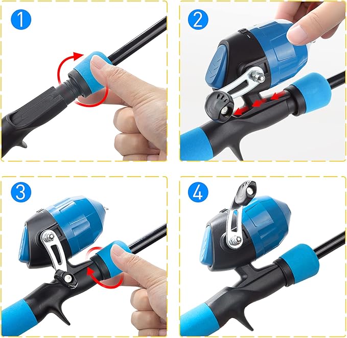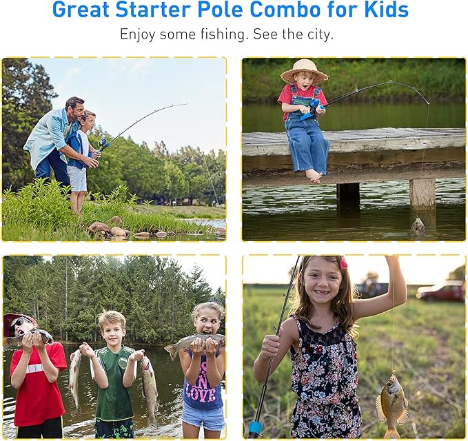 - 【Fishing Pole Starter Kit for Kids】This fishing pole and reel combo contains everything a child needs to get started organized with the handy carrying case - 4.92 FT telescopic fishing rod for boys girls+fishing reel with pre-spooled line and extra 50m line + 64pcs colorful lures and hooks set in tackle box + carrier bag + operating manual.