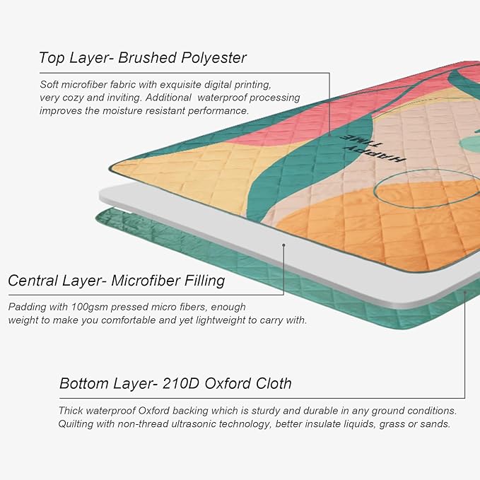 - Premium Three Layers Design: Crafted with soft brushed fabric on top, thick microfiber padding, and 210D Oxford backing. Both sides feature a waterproof coating, while ultrasonic quilting improves moisture resistance and insulation from grass or sand