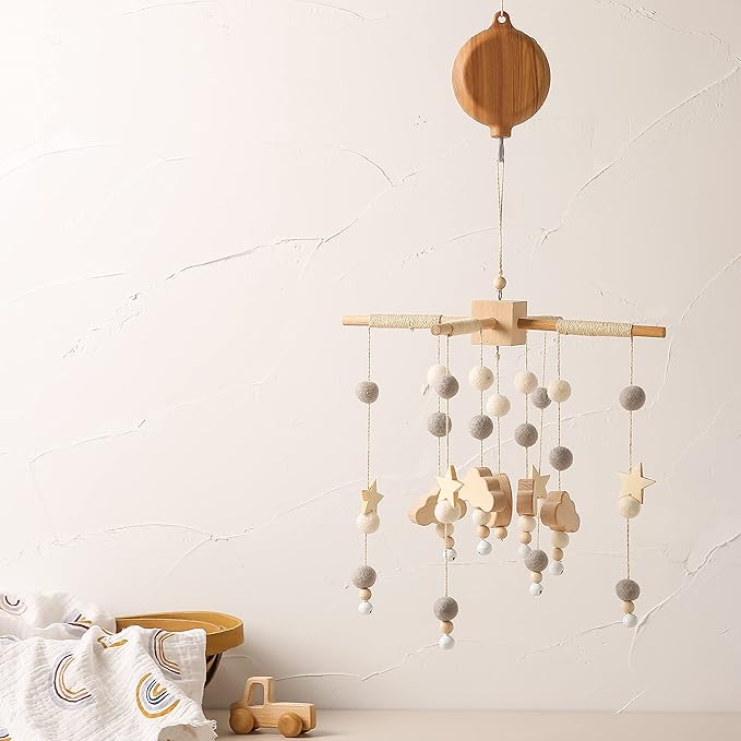 - 【Unique Texture 】: The unique texture makes the music box fit into many wooden baby mobile arm, bohemian, natural and beautiful, decorating a more beautiful bedroom for your child.Musical Box fits most crib mobile hanger,crib mobile arm.2 AA batteries are required, not included