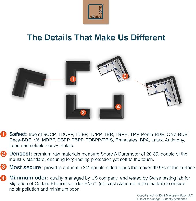 - CLEAN SAFETY: Roving Cove uses safe and pure raw material and was the first brand to make foam safety bumpers without the use of toxic flame-retardant chemicals (SCCPs). Our corner protector contains no BPA, no phthalates, no heavy metals, no latex, no SCCPs. Inherently flame-resistant; passed flammability tests under US regulations.