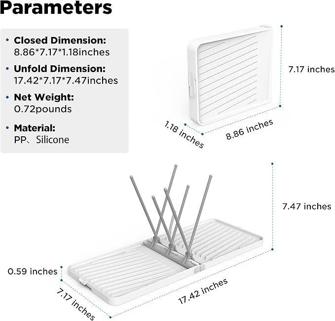 - ✈【Foldable Design】The size of the portable bottle drying rack for baby bottles is 17.42 x 7.17 x 0.59 inches when opened for use. It can be folded for storage when traveling or when not in use, and it measures only 8.86 x 7.17 x 1.18 inches when folded.