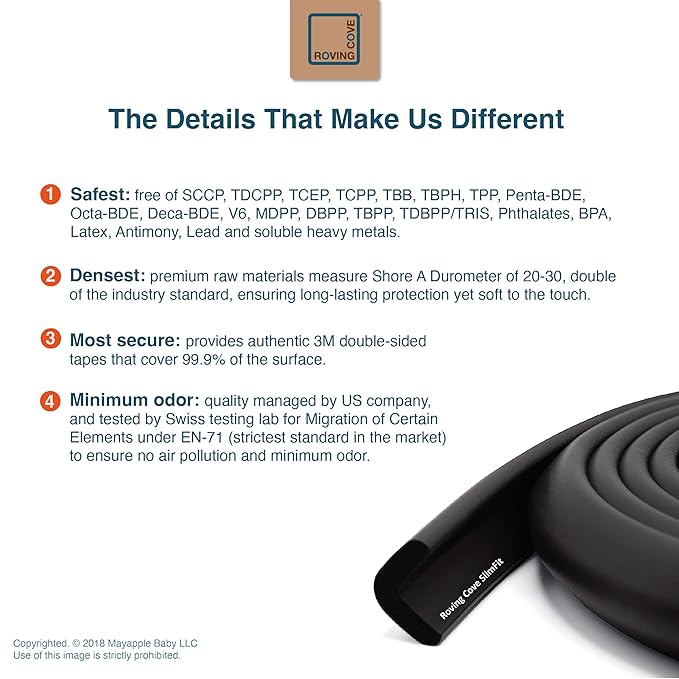 - CLEAN SAFETY: Roving Cove uses safe and pure raw material and was the first brand to make foam safety bumpers without the use of toxic flame-retardant chemicals (SCCPs). Our edge protector cushion contains no BPA, no phthalates, no heavy metals, no latex, no SCCPs. Inherently flame-resistant; passed flammability tests under US regulations.