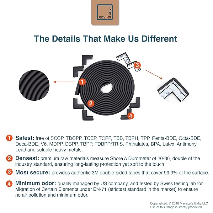 - CLEAN SAFETY: Roving Cove uses safe and pure raw material and was the first brand to make foam safety bumpers without the use of toxic flame-retardant chemicals (SCCPs). Our edge corner guards contain no BPA, no phthalates, no heavy metals, no latex, no SCCPs. Inherently flame-resistant; passed flammability tests under US regulations.