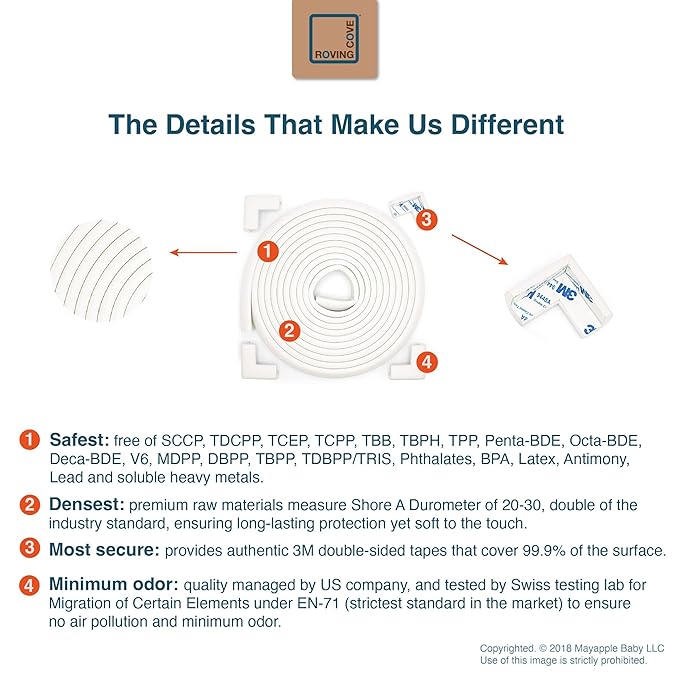 - CLEAN SAFETY: Roving Cove uses safe and pure raw material and was the first brand to make foam safety bumpers without the use of toxic flame-retardant chemicals (SCCPs). Our edge corner guards contain no BPA, no phthalates, no heavy metals, no latex, no SCCPs. Inherently flame-resistant; passed flammability tests under US regulations.