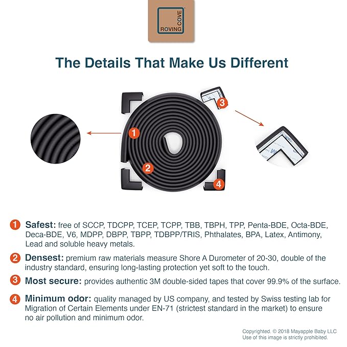 - CLEAN SAFETY: Roving Cove uses safe and pure raw material and was the first brand to make foam safety bumpers without the use of toxic flame-retardant chemicals (SCCPs). Our edge corner guards contain no BPA, no phthalates, no heavy metals, no latex, no SCCPs. Inherently flame-resistant; passed flammability tests under US regulations.