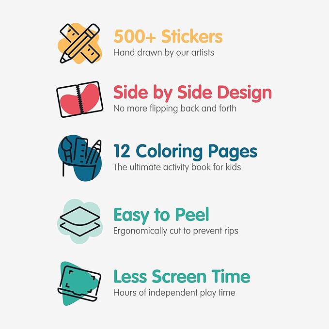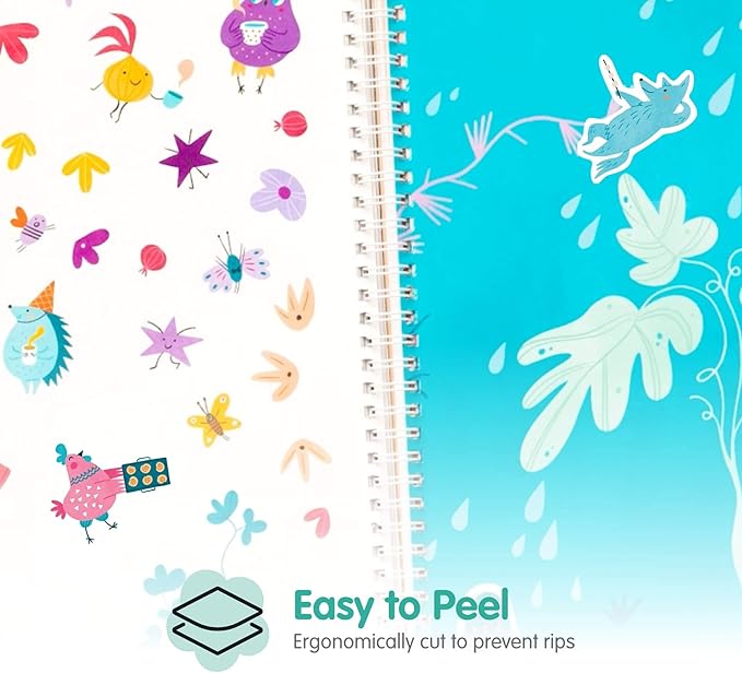 - The original lay-flat sticker book: We created the side-by-side sticker pages & scenes with tiny hands in mind. The spiral binding allows for more time creating and less time flipping back and forth. Your kids will stay busy for hours crafting different scenes with these easy-to-peel stickers. Our spiral-bound sticker and coloring activity books are perfect for ages 2-4 and beyond!