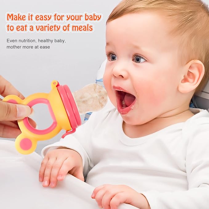 - 【TRY SOLID FOOD FLAVORS】HAOBAOBEI silicone feeder set including 2 pack baby silicone feeder with 4 silicone pouches, which is designed to fit for each age. Just put fresh fruits, food or frozen breastmilk, your baby will enjoy the taste of solid foods by chew the baby feeder.