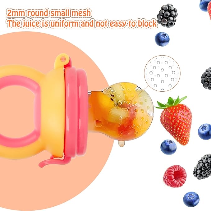- 【SAFE SILICONE POUCH HOLES】HAOBAOBEI fruit feeder is made from 100% food grade silicone. BPA free. Lead, phthalates, latex free. 2mm silicone pouch hole, the juice is even and not easy to be blocked. When the baby bite the feeder pacifier, the food enters the baby's mouth in the form of fine and digestible drops, which will not choke the baby and avoid the risk of suffocation.