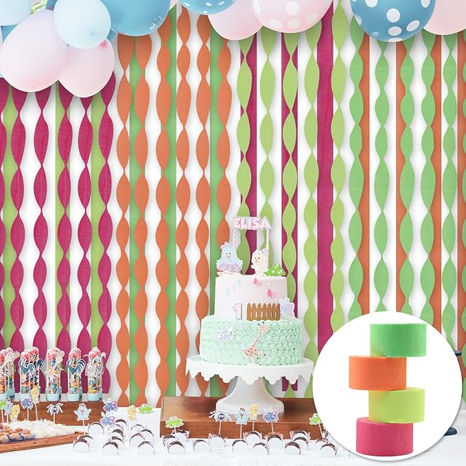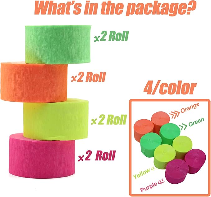- Ideal Size and Bright Colors: Package contains 8 rolls of large sized crepe paper streamers in 4 colors of green, orange, yellow, pink. They are Neon Colors under normal light, but glow under black light. 800 feet/Each roll measures approx. 1.6 inches in width and 100 ft in length. Ideal Size for neon Party supplies