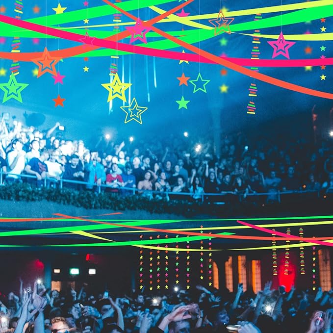 - Easy to use and decorate: The Glow Party streamers with bright colors are suitable for you to make DIY decorations. They can decorate your ceiling, door, window, book shelf, porch, garden, yards and other places. They are bright under daylight and glow only under Specific UV light, which Will Bring You an Amazing and Fun Neon Party.