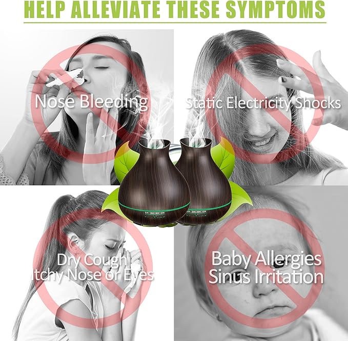 - REDUCE ALLERGIES SYMPTOMS IN WINTER DRY CLIMATE: This aromatherapy diffuser could provide a large mount of fresh air for those who suffer from Dry Cough, Itchy Nose or Eyes, Allergies Sinus Headaches, and Sleeping Problems, Dry Skin. Helps to improve breathing and sleeping, relieve allergy, reduce static electricity shocks in the dry climate. Add to cart now, deserve one for yourself, parents, friends, business partners as Christmas gifts, mother's day or father's day gift, birthday gift, weddin