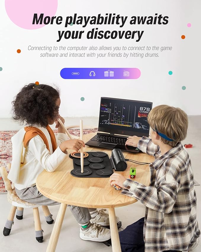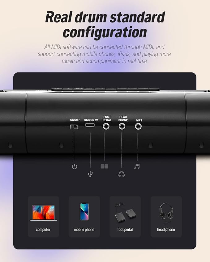 - [MIDI Connect & Gameplay] Come with standard midi out jack and USB midi out jack, you can connect the drum to computers to produce music or play games, or connect external speakers for family entertainment/birthday parties. Perfect for adults who need MIDI functionality and children for entertainment.