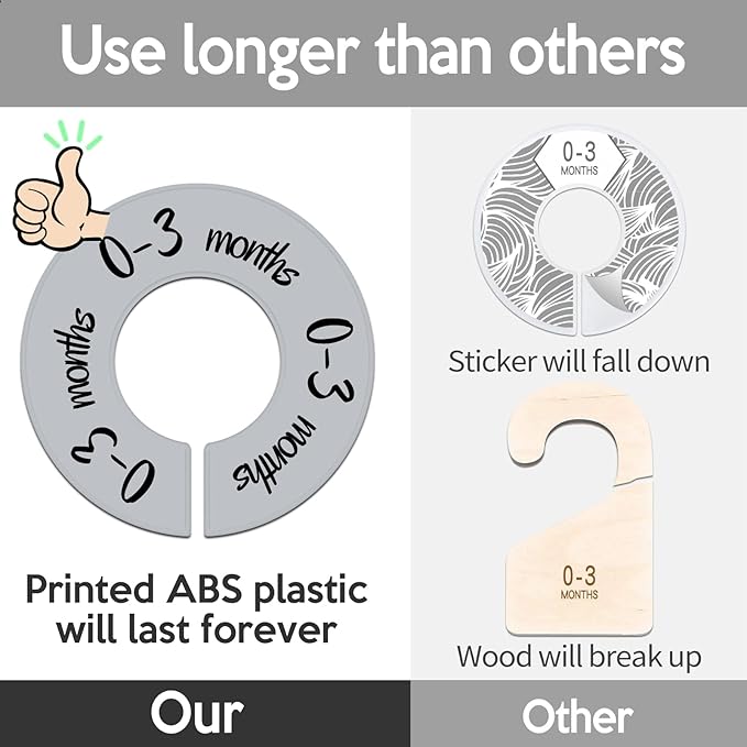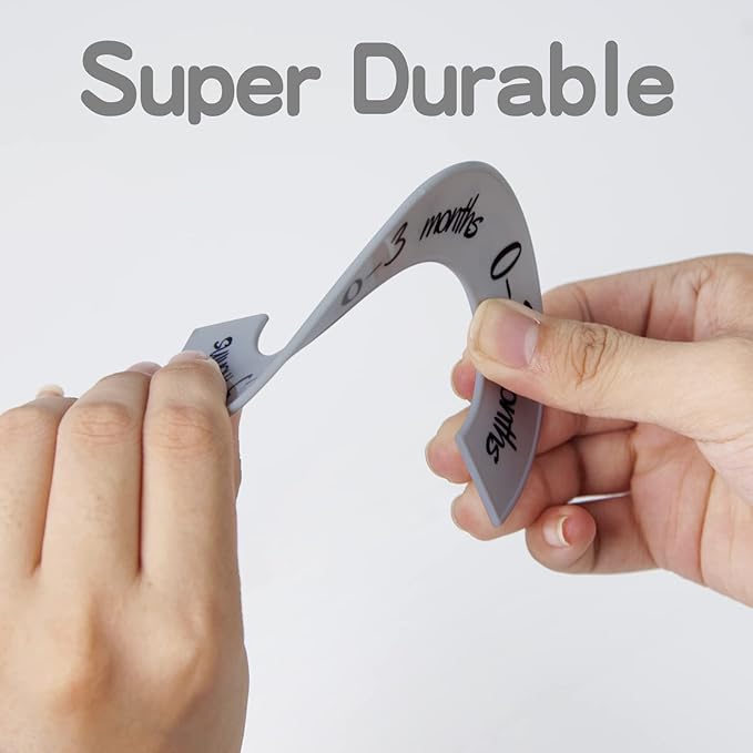 - 【Double Printed】:The Baby Closet Dividers are double printed big words all over the plate so that parents can easily see it clearly even the Baby Closet Dividers are not staying upright. In addition, printed word will not fade but the sticker will fall down