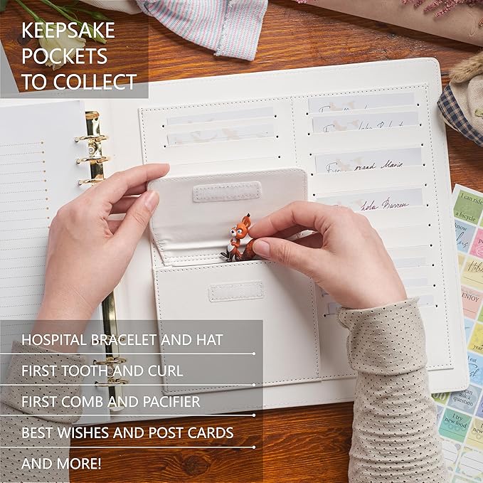- Deep Keepsake Pocket - Beautiful baby 1st year memory book and a shower gift with a deep keepsake leather envelope to store baby's hospital bracelet and other memorable items.