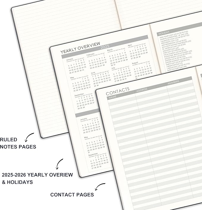 - ✨ Durable soft leather cover, excellent texture. 2025-2026 yearly holidays lets you master the holidays clearly. The planner offers unruled monthly pages/ruled weekly layouts for detailed planning.