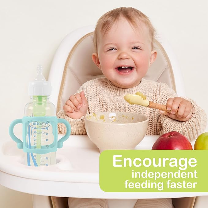 - DUAL EASY-GRIP HANDLES - Encourage independent feeding faster and more effectively with 2 easy-grip handles. Unlike other baby bottle holders, the handles are smoother, longer, and more ergonomic for a more natural grip