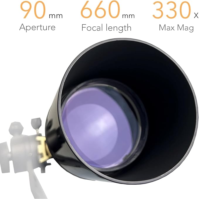 - 【Fully Multi Coated Glass Optics 】Experience the breathtaking beauty of the night sky with this professional telescope for kids, celebrated for this outstanding fully Multi Layer coated glass optics featuring Magnesium Difluoride coatings. These advanced Refractor telescope deliver images of unparalleled clarity and sharpness, making celestial observations a truly immersive experience. Boasting a 90mm aperture and 660mm focal length, this telescope is perfectly suited for a wide range of celestial wonders, including the Moon, Jupiter, Mars, and other stars when weather conditions allow. It's the ultimate telescopio profesional para ver planetas.