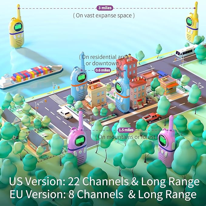- With clear sound and long range capability, these two-way radios provide 22 channels and work up to 3 miles in open areas. Kids can enjoy stable and clear communication from half a mile to one mile in typical environments. Please note that hills or buildings may affect the range.