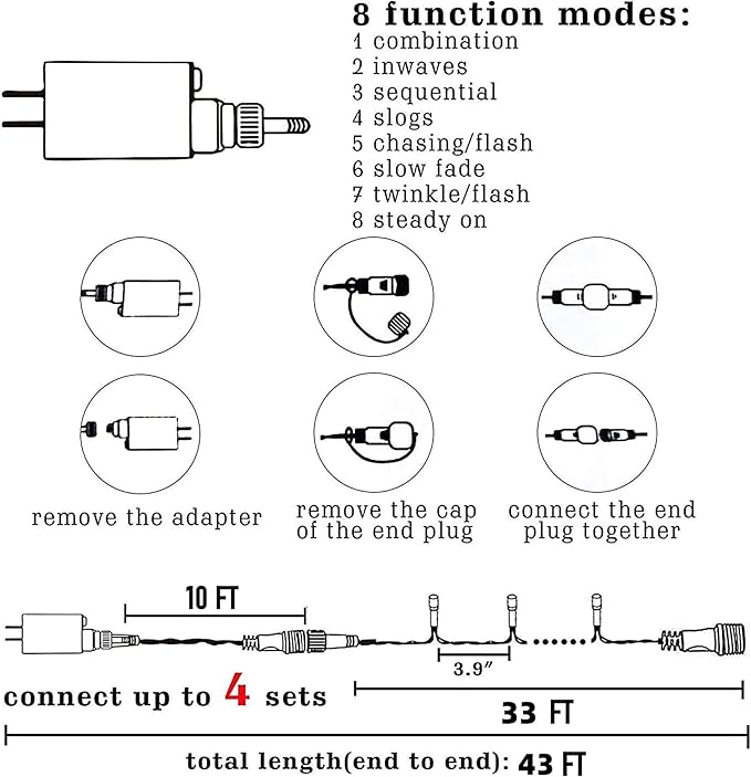 - 8 Lighting Modes: 8 Modes for you to choose: combination, in waves, sequential, slogs, chasing/flash, slow fade, twinkle/flash, and steady on. You can select your favorite flash mode by pressing the mode button on the plug.