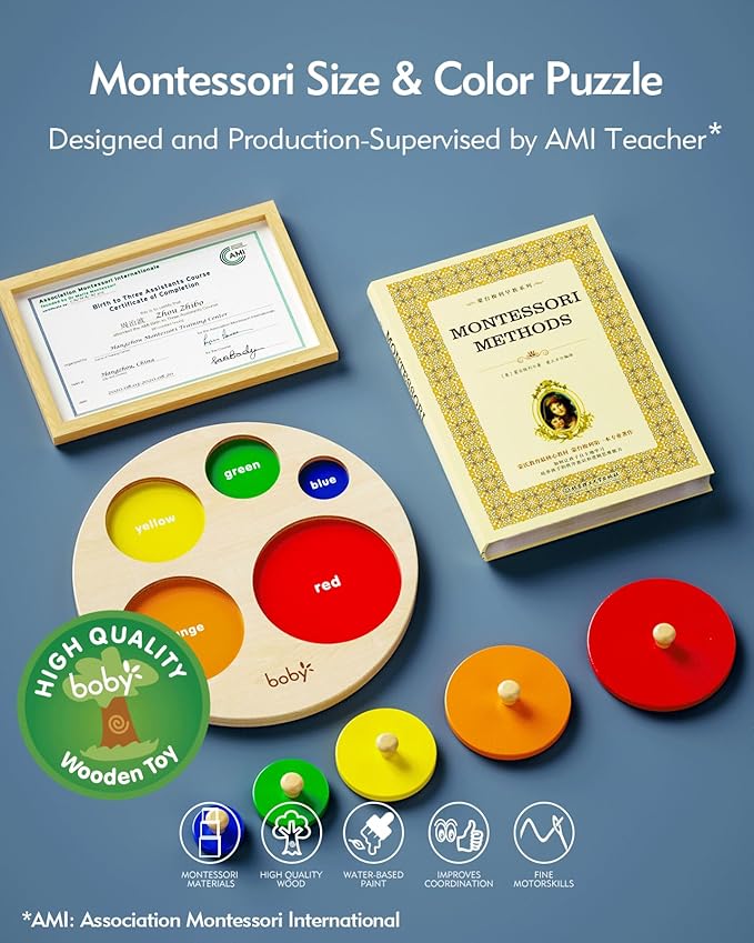 - 【Montessori Size Puzzle】This attractive puzzle stimulates hand-eye coordination and fine motor skills of the young child. 5 graduated sizes of circles are placed in the right proportions and enable the child to learn the difference between ‘big’ and ‘small’. The size puzzle introduce the child to the first stage of visual discrimination of size and color. Use of this material helps children develop their problem solving skills, size discrimination and visual perception.
