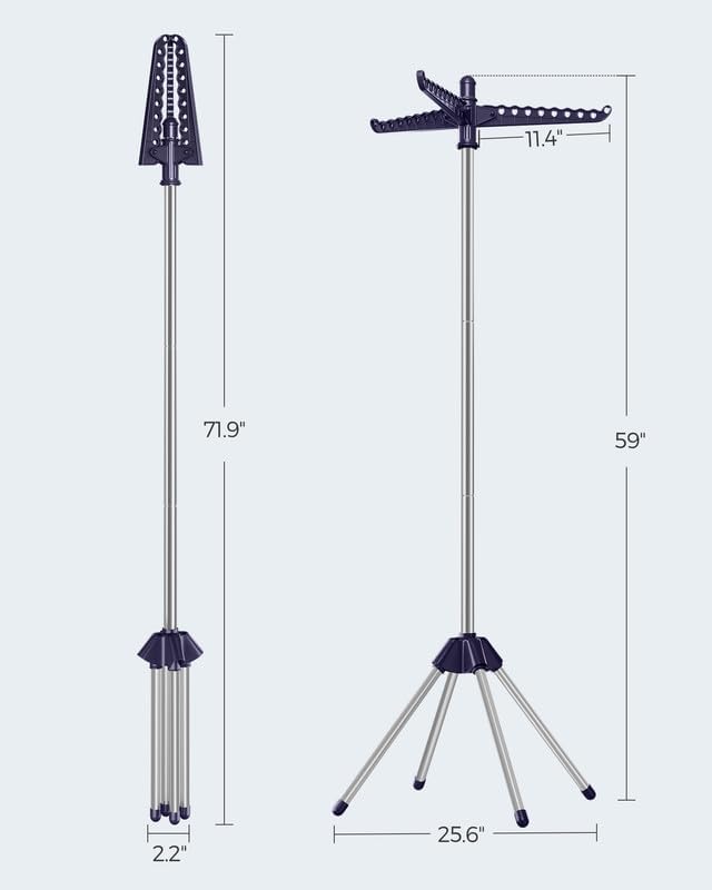- [Foldable & Space-Saving] Standing at 25.6”D x 25.6”W x 59”H during use, this clothes drying rack takes up little space, perfect for small spaces. Fold the arms and legs into a small size of 2.2”D x 2.2”W x 71.9”H, it will stay out of the way after use