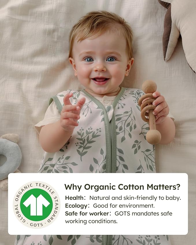 - 100% Organic Cotton: Soft, breathable, and gentle on sensitive skin, our sleep sack is made from high-quality cotton. Certified by the Global Organic Textile Standard (GOTS), we prioritize your baby’s comfort and safety.