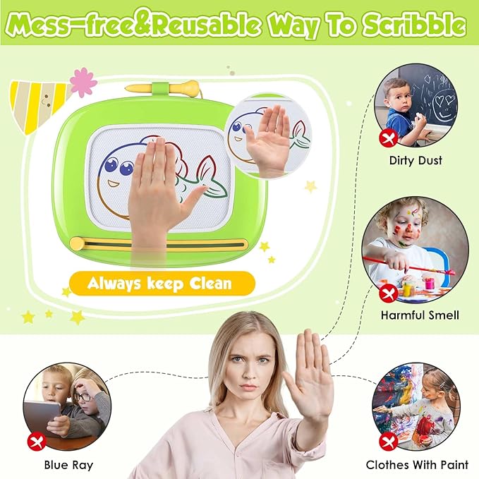 - 🎨Red/Blue/Green/Yellow Colors Zones: Magnetic doodle board for toddlers 1-3 displays 4 different colors that make child’s drawing more vivid. With 9.8" doodle pad, the toys for girls can be used repeatedly. Your one year old girl can easily pull the slide back and forth, then it will be clean immediately.