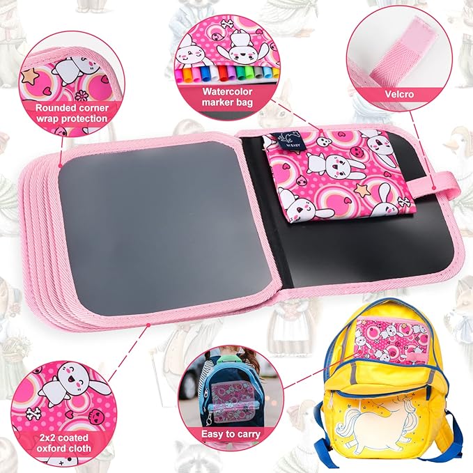 - 🎨Kid's Road Trip Essentials--Kids Erasable Graffiti Book has sticky buttons on the outside to keep it in place and a pens pocket on the inside for 12 watercolor pens. Even in cars, planes and other means of transportation, kids can draw as much as they want.
