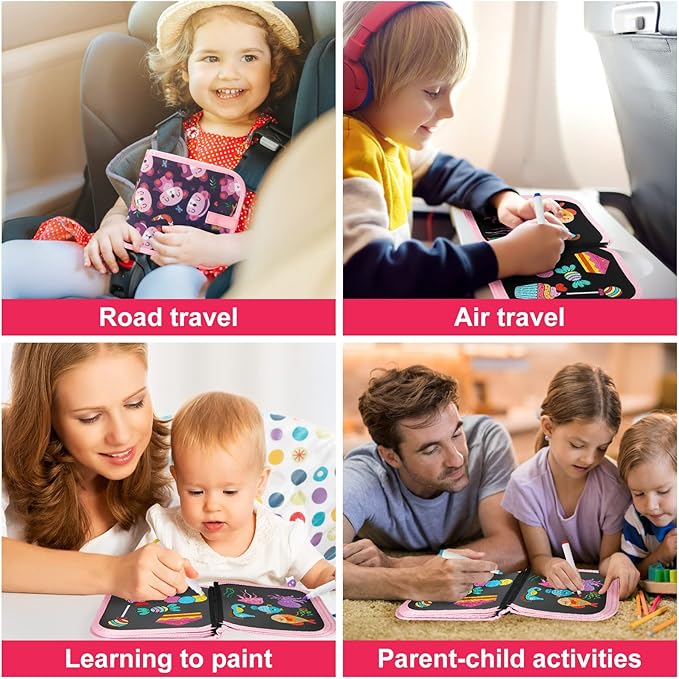 - 🎨Kid's Road Trip Essentials--Kids Erasable Graffiti Book has sticky buttons on the outside to keep it in place and a pens pocket on the inside for 12 watercolor pens. Even in cars, planes and other means of transportation, kids can draw as much as they want.