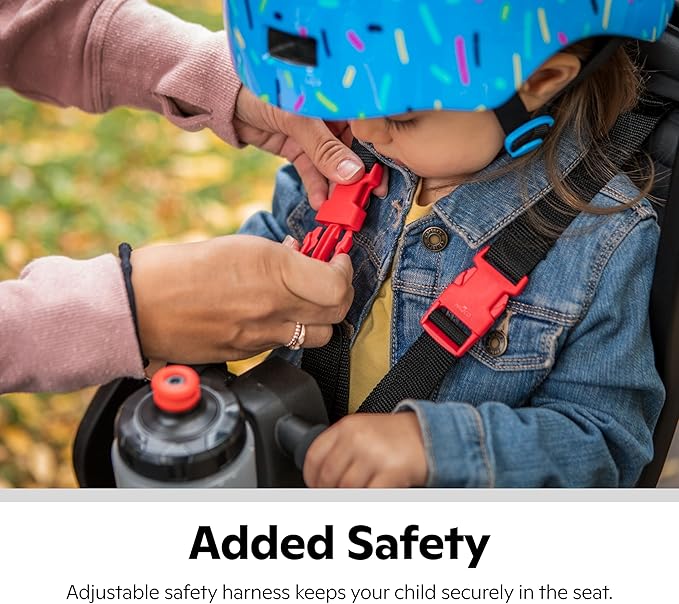 - SAFETY FIRST: Adjustable harness with side-clasp buckles and height-adjustable foot wells with safety straps keep your child securely fastened in the kid bike seat while riding.