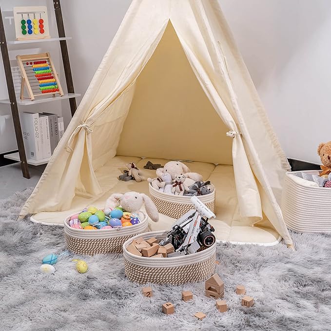 Shelf Storage Baskets for Organizing|Decorative Basket for Closet Storage|Toy Baskets&Bins|Small Woven Rope Baskets-13x8.66x5.11’’,Durable&Stylish,Oval 3 Packs Off White&Mixed Camel