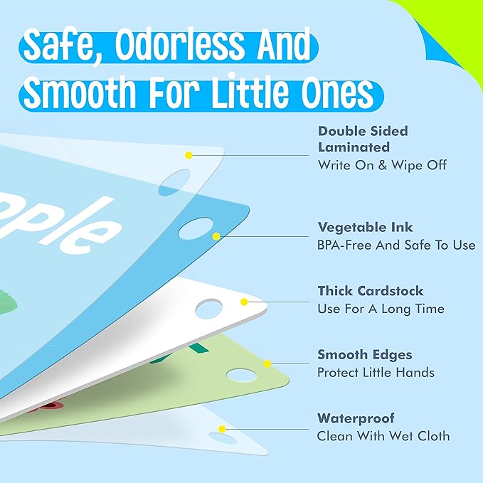 - Well Made: The card adopts sturdy and thickened paper material with PET film on both sides, durable and tear resistant. Printed with premium non-toxic vegetable oil-based ink, BPA-free and safe for babies to use. Bright colors and cute designs catch kids’ eyes and evoke a sense of excitement and joy. When children are surrounded by these colorful flashcards, they are more likely to be engaged and interested in what they are learning.