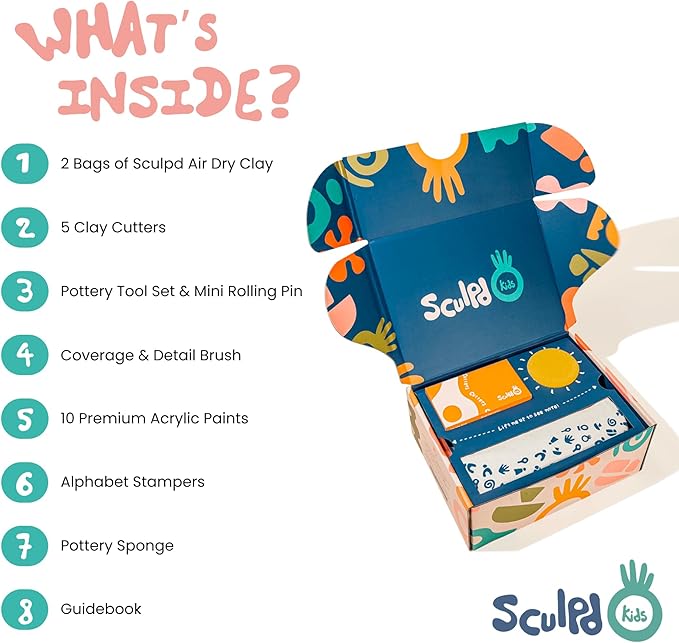 Sculpd - The Original Kids Pottery Kit, Air-Dry Clay Starter Kit for Kids Age 4 to 6, Air Dry Clay with 10 Colour Paint Set, Paintbrushes, Tool Set, Alphabet Stampers, Sponge and Step-by-Step Guide