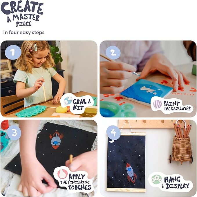 - KIDS PAINTING KIT 🎨 - In this crafty kit, kids will find everything they need to paint eight amazing works of art! They'll have their very own collection of paintings to display proudly in their room (or should we say gallery!). Create abstract and pop-art pieces on a hanging canvas and two mini-canvases.