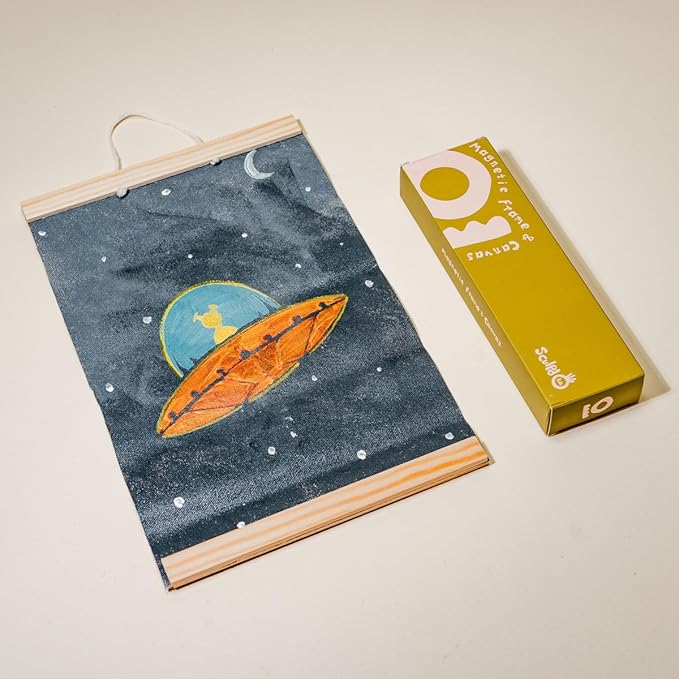 - WHAT’S INSIDE? 📦 – Our Mini Painting Kit contains a magnetic picture frame with 2 canvases, 5 set of paints, paint palette, 3 paint brushes and sponge, 3 stencils, paper shapes, practice paper and guidebook.
