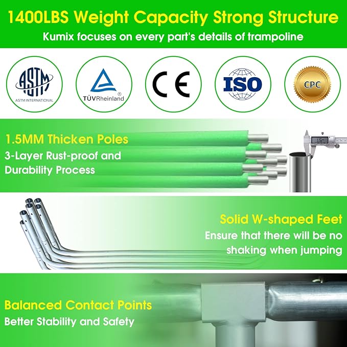 - 1400Lbs Max Weight Capacity: SKYUP 14FT trampoline passed ASTM F381-16 Standard Safety Specification for Components, and CPC, Chemical Test. Due to the 8PCS heavy-duty galvanized steel frame, 4 U-legs, and 80pcs galvanized springs, the trampoline is sturdy and can hold a capacity of up to 6-7kids. Advise SINGLE person to weigh no more than 330LBS