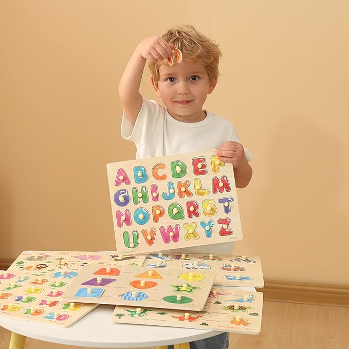 - [6 PCS PUZZLE GIFT PACK]: Package comes with a box and 6 wooden peg puzzle-alphabet puzzle , a number puzzle, a shape puzzle, an animal puzzle, a dinosaur puzzle and a vehicle puzzle.