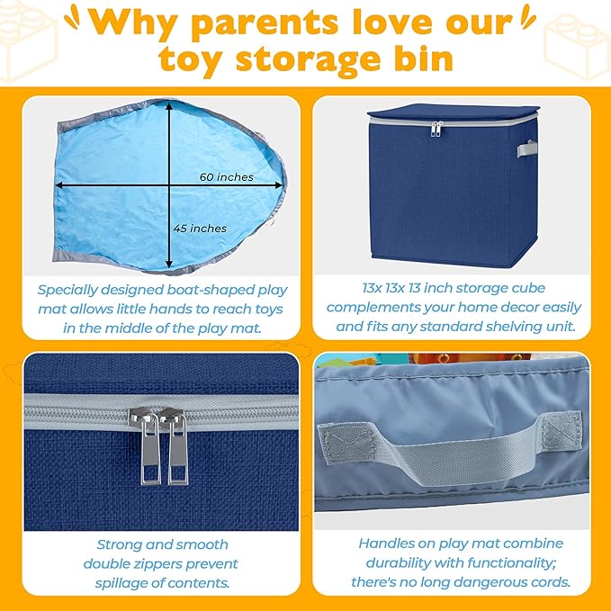 - Safe, Functional And It Has Zippers – There are no tangly cords or buttons to worry about, making it safe for kids of all ages. Our play mat has durable handles for tipping the toys back into the storage bin. We have also included double zippers on the lid so that nothing can spill out accidently. Warning: Children below 3 years of age must be supervised when using this storage bin and its play mat.
