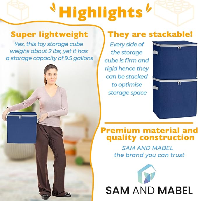 SAM AND MABEL Toy Storage Organizer with Play Mat for Kids – 13" x 13" x 13" Storage Box, Stackable and Foldable Cubby Baskets for Playroom, Nursery Bins for Boys and Girls (Noble Blue)