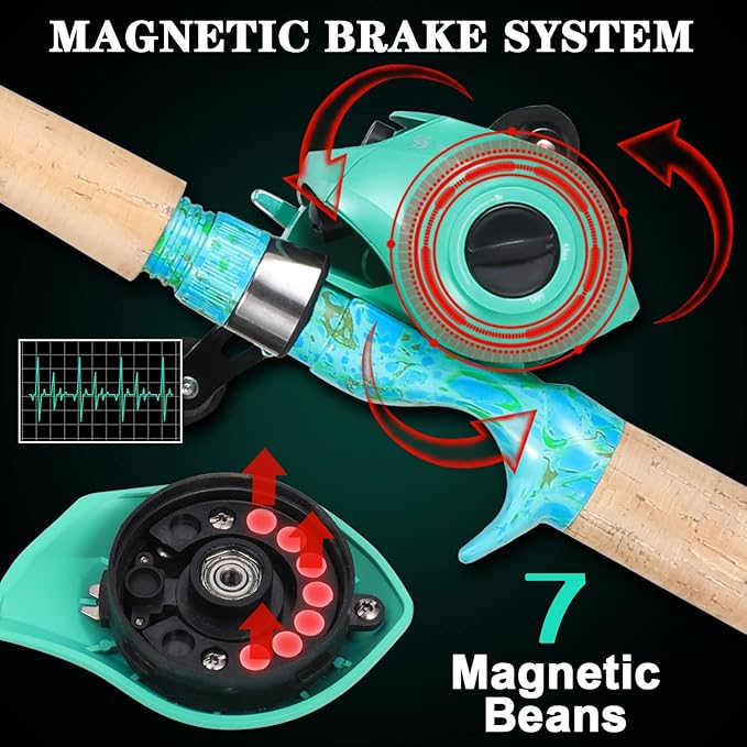 - THE REEL: The brake system is powerful and durable,8.1:1 gear ratio,high-speed gear ratio that can pull in a large catch quickly.5 side-by-side strong magnets to effectively prevent throwing lines.Aluminum alloy deep wire cup, light and narrow.9+1 corrosion resistant ball bearings and the manganese brass main gear and pinion are used to improve strength and durability. Nickel-plated brass is used for long service life and superior performance.
