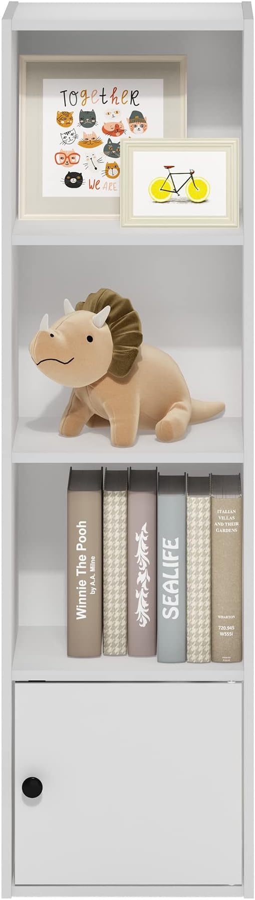 - Features 3 open shelves for display and storage. Closed cabinet at the bottom to keep your room away from clutter. Each shelf holds up to 15lbs.