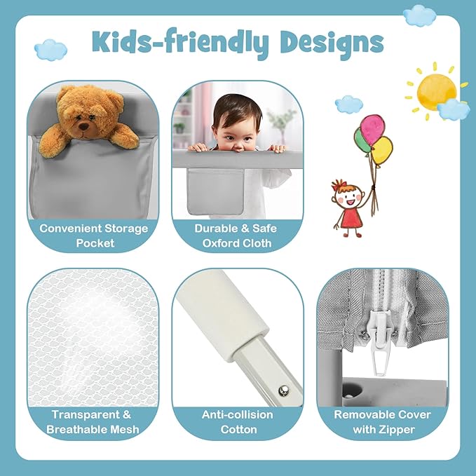 - [ Kids-friendly Material with Safety Ensured ]: The frame of bed rail is made of sturdy steel and wrapped with anti-collision cotton & premium oxford cloth, which ensures excellent stability, safety and durability. What’s more, the breathable mesh keeps good air circulation and is convenient for parents to observe children. By the way, the cloth is easy to remove for daily cleaning.