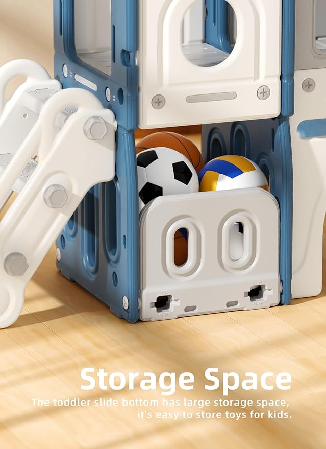 - 7-in-1 Toddler Playground :The toddler slide has 7 activity areas, including stairs, slides, 2 storage spaces, basketball area, aisle, play telescope and climbing area at the bottom