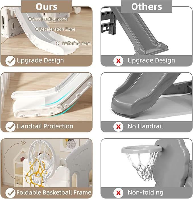 - Great Gift Idea: This multi-functional playset is an excellent gift choice for children, providing endless entertainment and opportunities for skill development. Children can climb, balance, slide, crawl, and shoot hoops, making it not only a fun toy but also a valuable tool for cognitive and motor development.